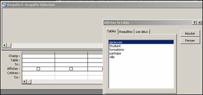 Une fois la requête en mode création demandée Access propose de sélectionner les tables nécessaires. Pour beaucoup de requêtes il est donc inutile de les sélectionner toutes pour chaque requête ; cela conduit parfois à de graves erreurs.
