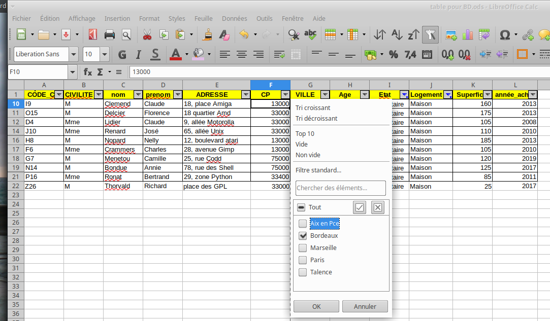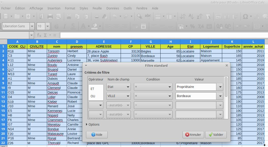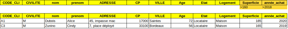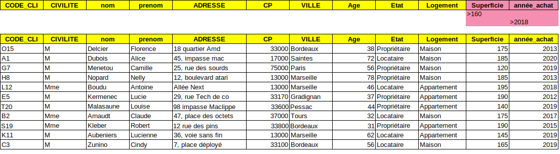 Dans les deux cas la manipulation de l'outil est simple ... si 💻 on a bien préparé la zone de critères. Celle-ci permet de préciser au logiciel ce que l'on souhaite et nécessite des intitulés de colonnes et des conditions sur celles-ci. Exemple avec les propriétaires de maisons à Bordeaux (qui pourront être extraits et rassemblés dans un tableau au-dessous).