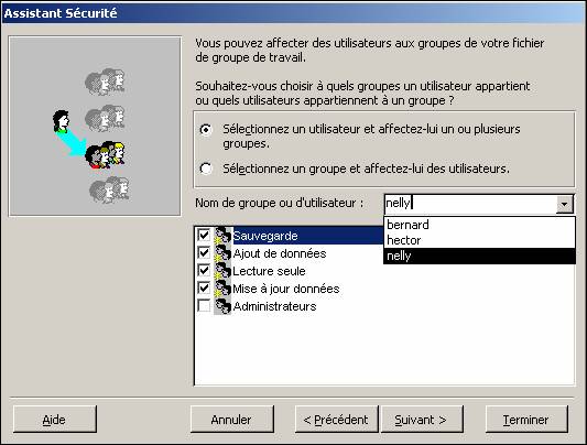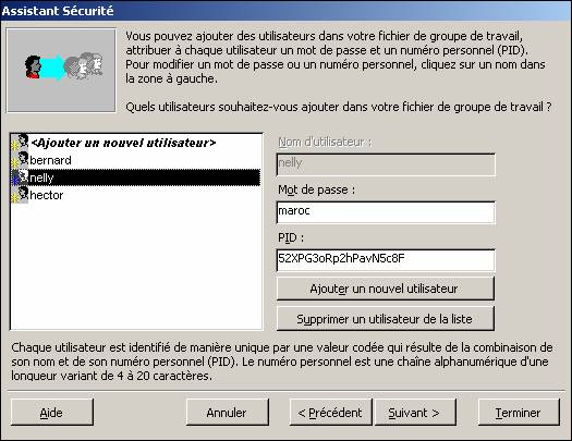 Dans l'exemple suivant Bernard est administrateur et dispose donc de tous les droits. Il accèdera à la base en utilisant son mot de passe (mot_passe). Hector sera simple utilisateur qui ne pourra que consulter (lecture seule) ; son mot de passe est pass_word. Enfin Nelly disposera des droits d'Hector, et aura en plus la possibilité de saisir et de mettre à jour des enregistrements (mot de passe maroc