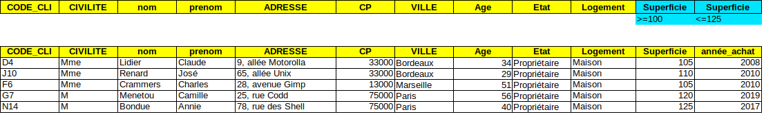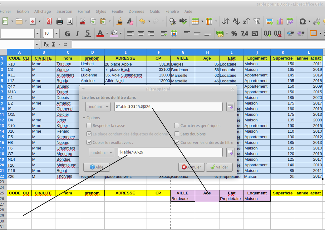 Dans les deux cas la manipulation de l'outil est simple ... si on a bien préparé la zone de critères. Celle-ci permet de préciser au logiciel ce que l'on souhaite et nécessite des intitulés de colonnes et des conditions sur celles-ci. Exemple avec les propriétaires de maisons à Bordeaux (qui pourront être extraits et rassemblés dans un tableau au-dessous).
