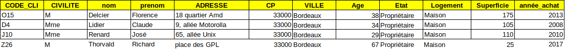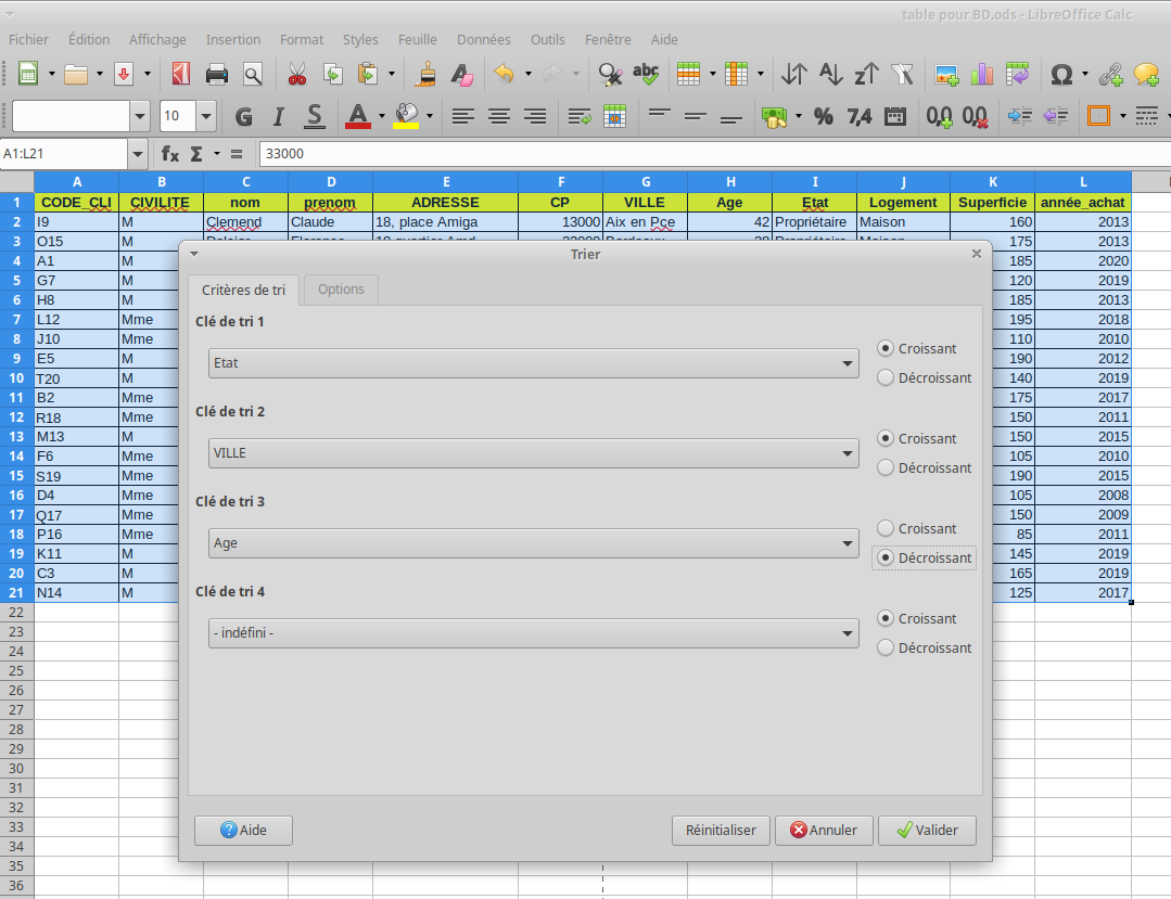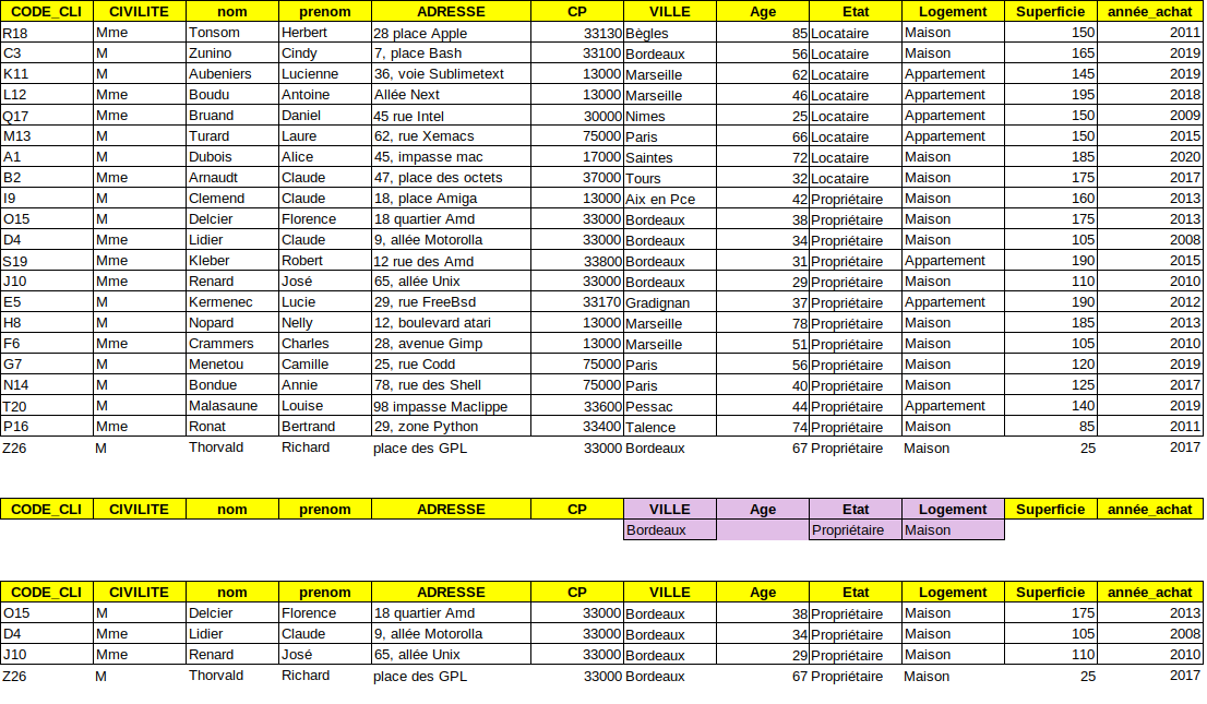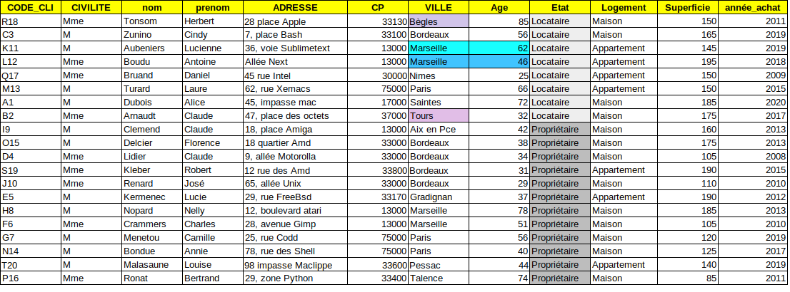 Ci-dessus on tri d'abord sur l'état (locataire/propriétaire), puis la ville et l'âge décroissant: